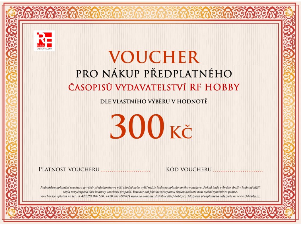 Voucher je vlastnictvím vydavatelství RF Hobby s.r.o., Bohdalecká 6/1420, 10100 Praha 10, IČO: 26155672; DIČ: CZ26155672, spisová značka: C 75215 – Městský soud v Praze. Hodnota uvedená na voucheru se nevyplácí v hotovosti. Za nevyčerpanou hodnotu voucheru nebudou vráceny peníze. Voucher není určený k prodeji a není nijak převoditelný. Zkopírovaný, poškozený nebo změněný voucher nebude akceptován. Voucher můžete uplatnit pouze ve vydavatelství RF Hobby, v oddělení distribuce na tel.: 281090620, 281090621 nebo na e-mailu: distribuce@rf-hobby.cz. Každý voucher lze použít pouze jednou. Voucher je určen pro nákup předplatného jakéhokoli titulu vydavatelství RF Hobby s.r.o. dle vlastního výběru. Nabídka předplatného je uveřejněna na www.rf-hobby.cz nebo na www.send.cz. Podmínkou uplatnění voucheru je výběr zboží ve shodné nebo vyšší hodnotě, než je hodnota uvedena na voucheru. V případě výběru zboží za vyšší hodnotu, bude částka nad rámec voucheru dofakturována a zboží bude vydáno až po úhradě doplatku. V případě výběru zboží za hodnotu nižší, zbylá nevybraná část voucheru propadá. Voucher je nutné uplatnit v době jeho platnosti, která je 1 rok od jeho zakoupení. Každý voucher je opatřen unikátním kódem, který je nutno předložit při uplatnění voucheru.